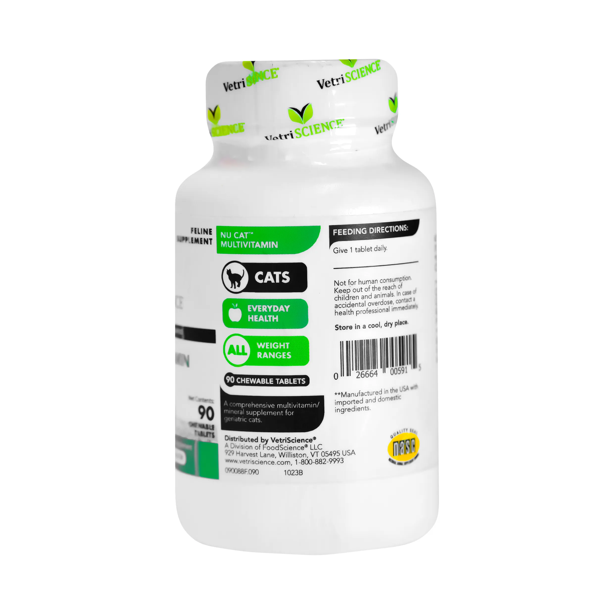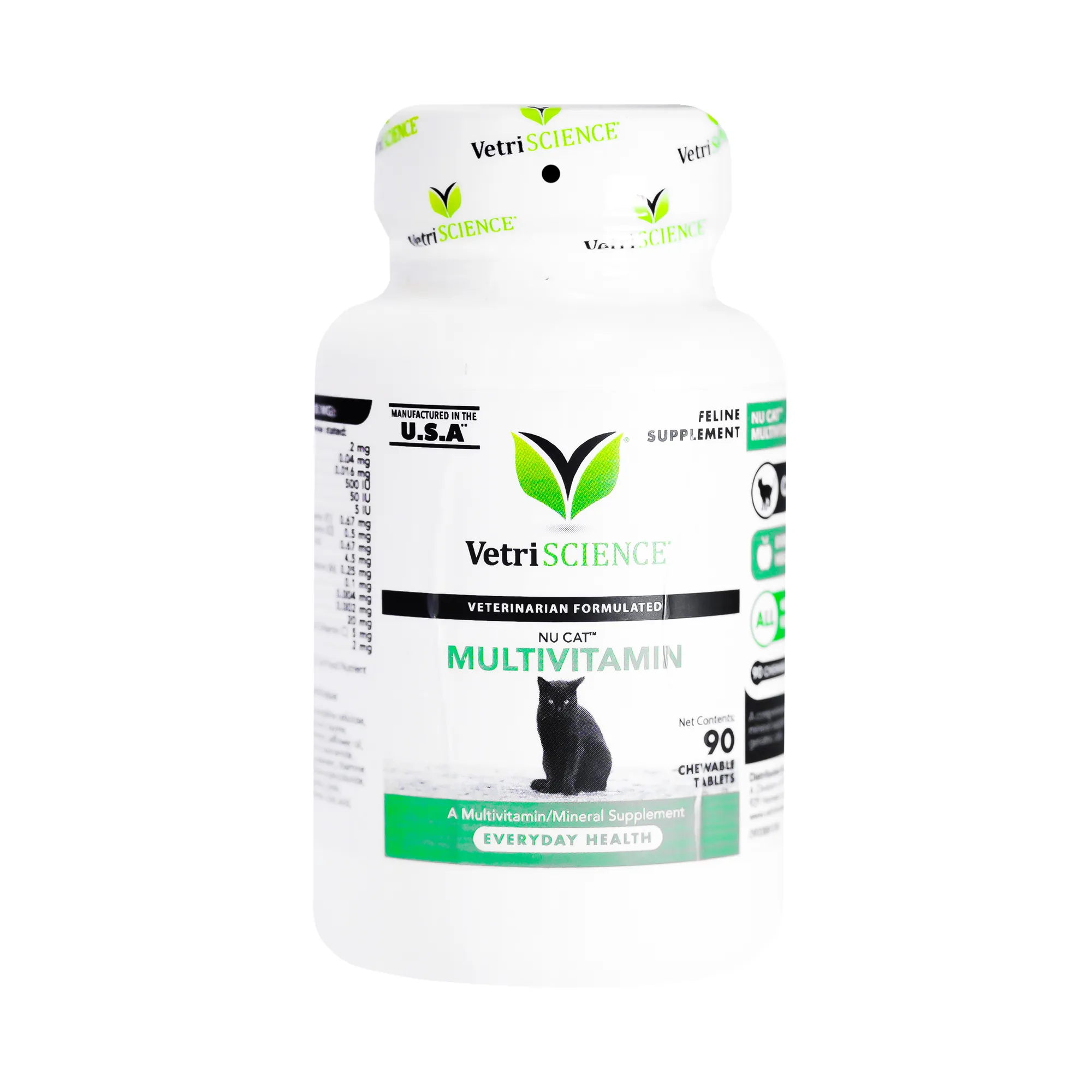 بطری سفید — برچسب سبز و مشکی — طرح گربه و لوگو VetriScience